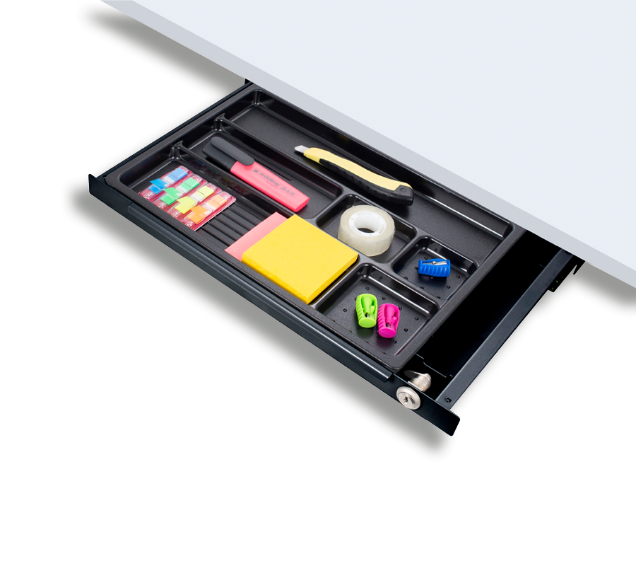 Ta praktyczna szuflada do przechowywania pozwala zwolnić miejsce do pracy, przenosząc akcesoria biurowe pod blat. Ergonomiczny design czyni ją praktycznie niezauważalną.