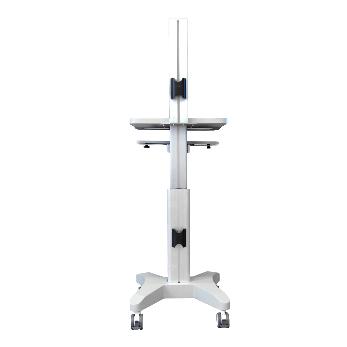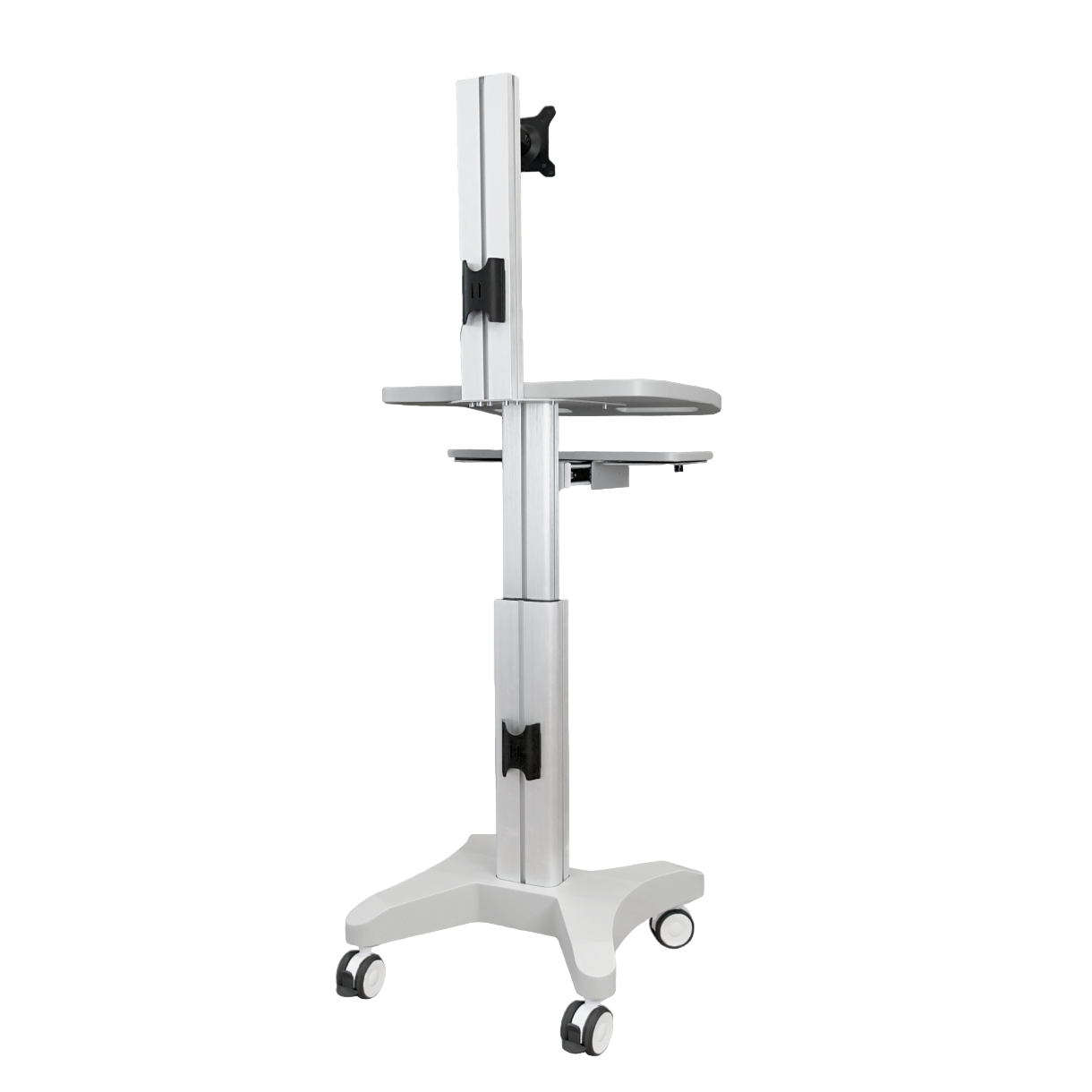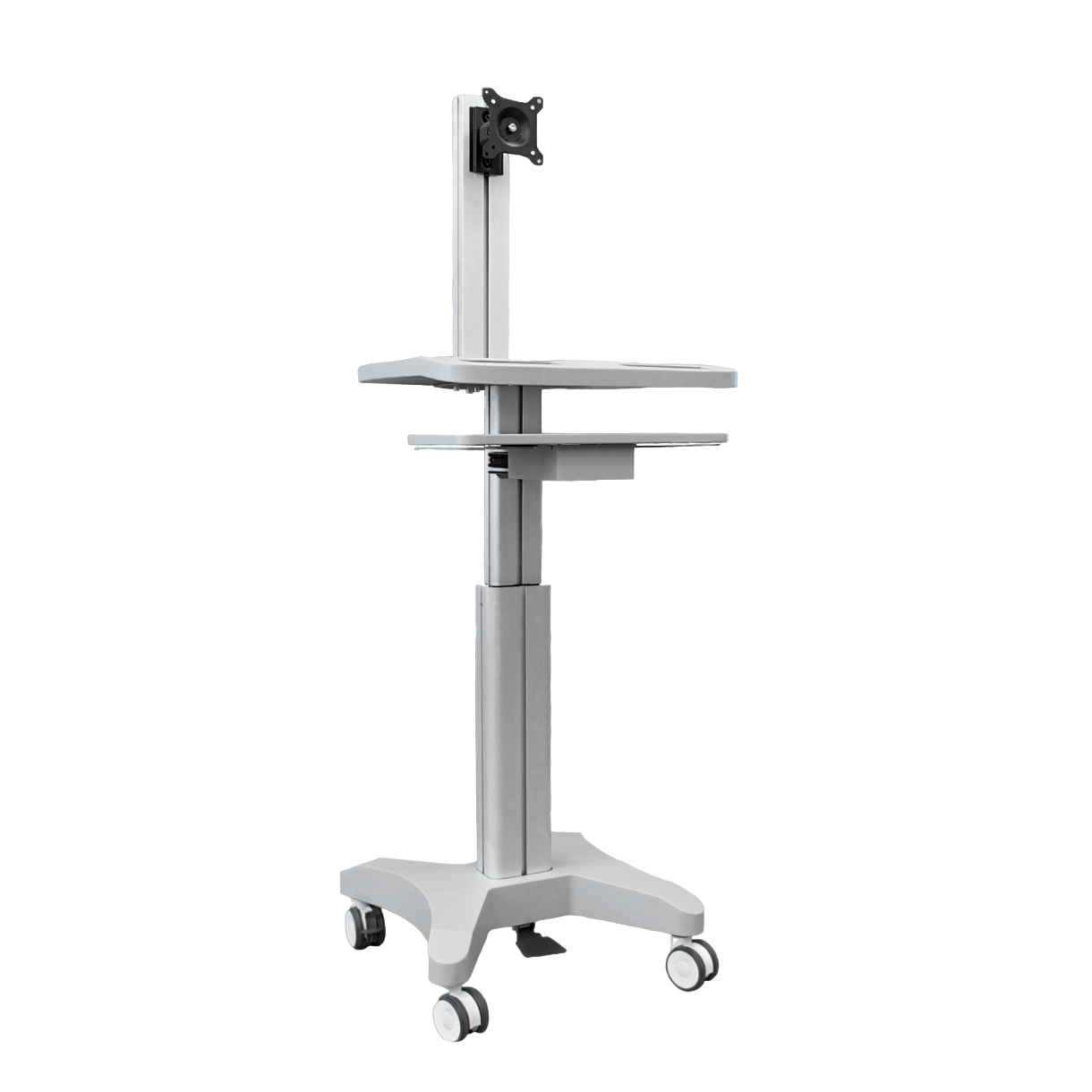 Напольная мобильная стойка для монитора диагональю 10–24" и полками, нагрузка до 65 кг, серебристая