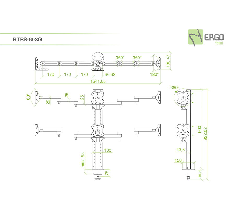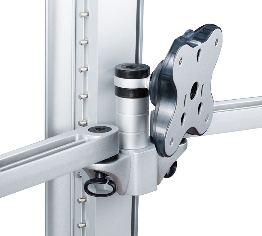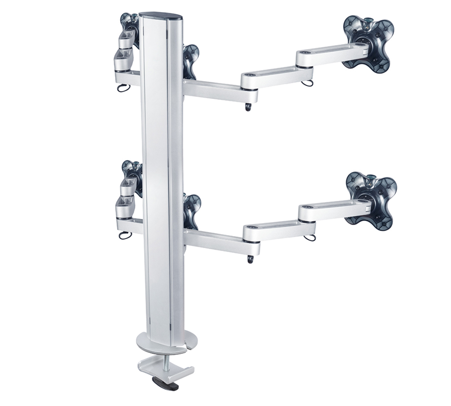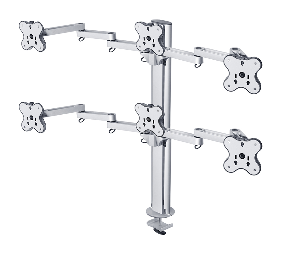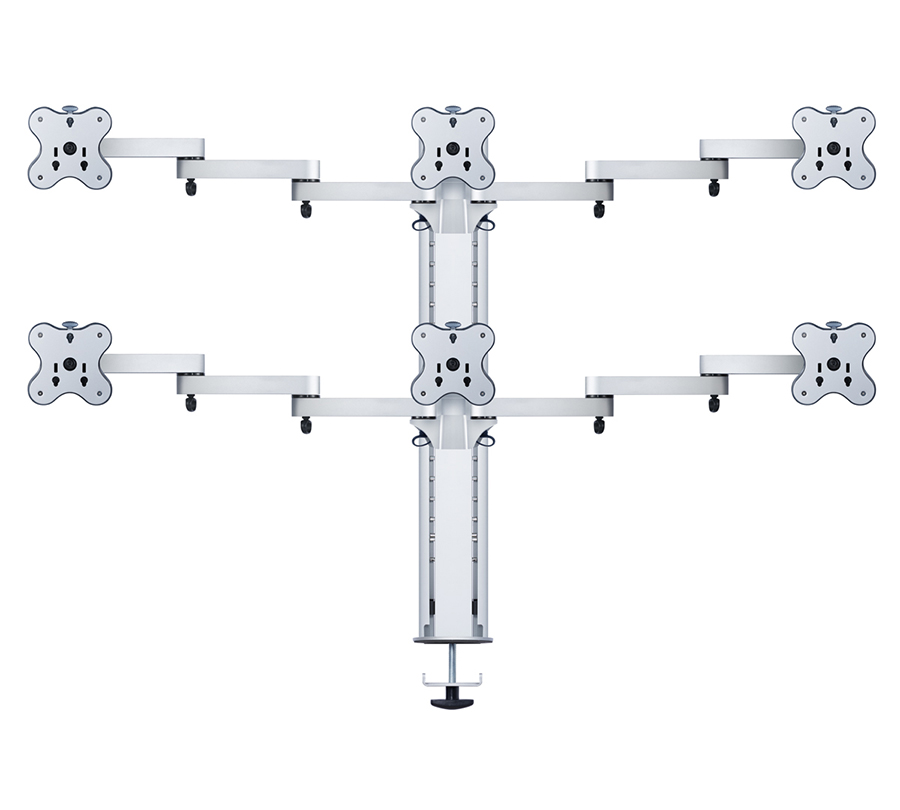 BTFS-603G mount allows to create a compact video wall from 6 monitors with a weight of up to 12 kg and a diagonal of 24'' each. Flexible 2-stage arms allow to perfectly position side monitors while cable channels will hide wires.
