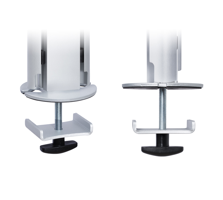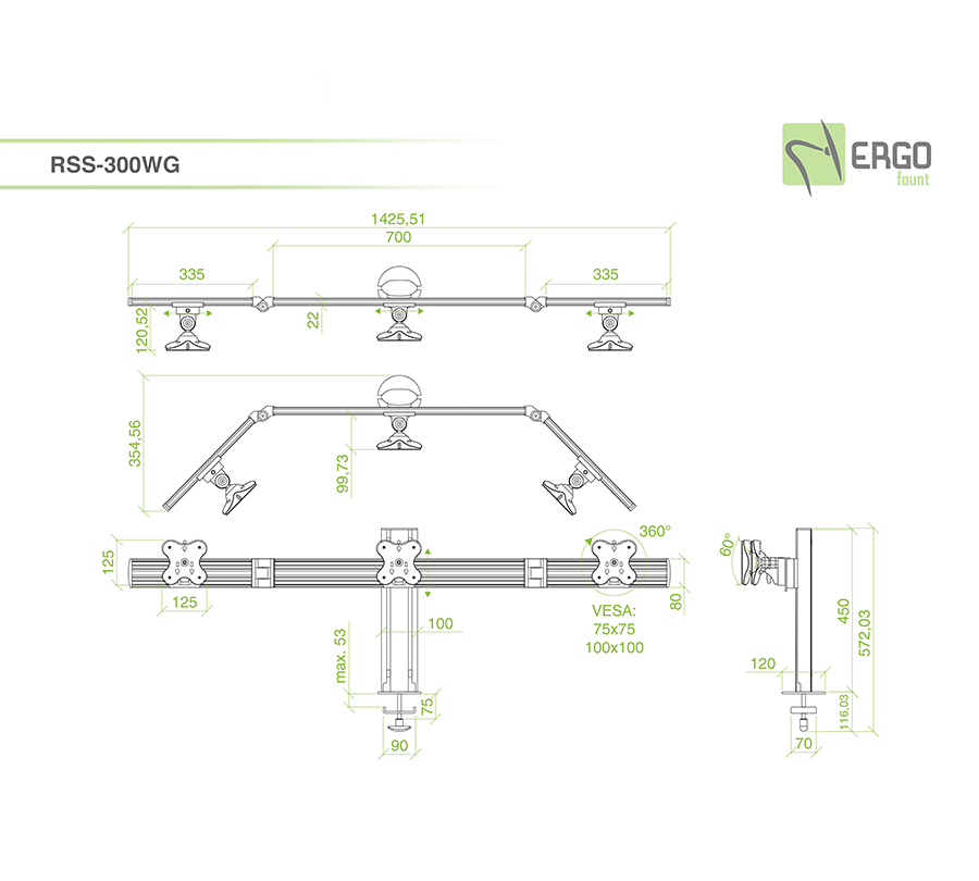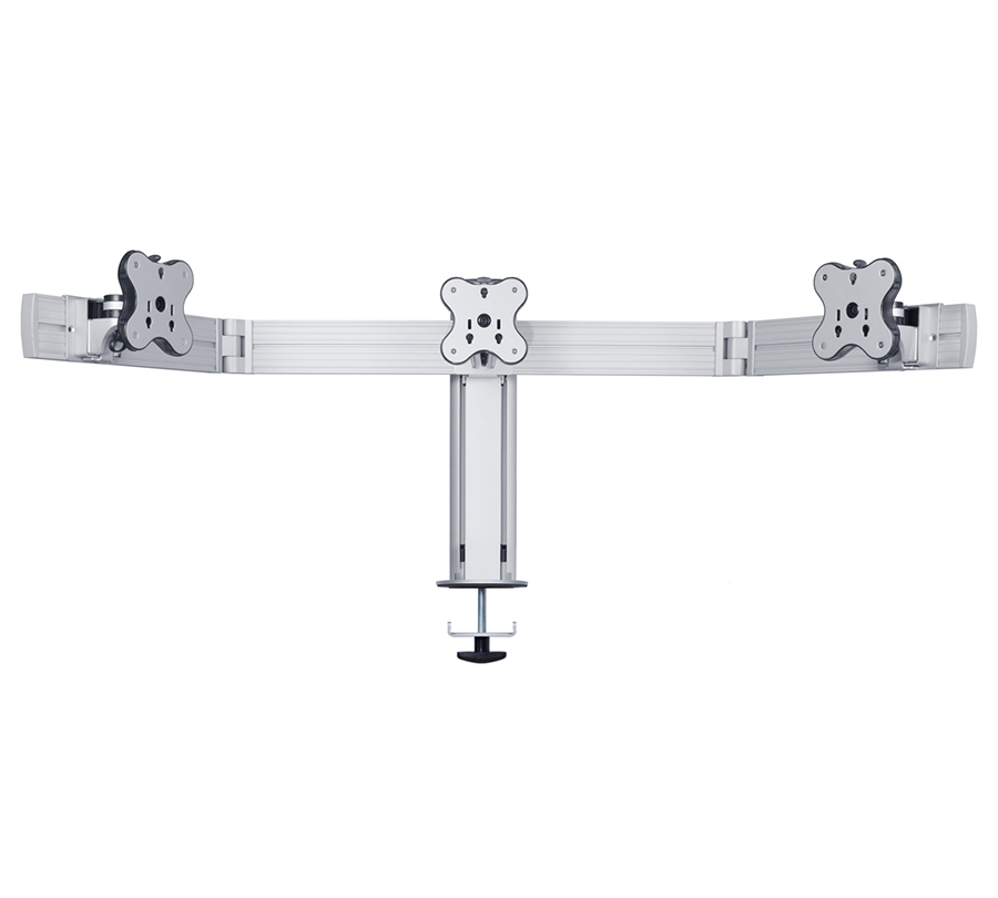 RSS-300WG tabletop mount will hold 3 monitors with the weight of up to 12 kg and a diagonal of up to 24'' at the same level. You can individualy adjust each side panel of the mount, creating the perfect view of several monitors.