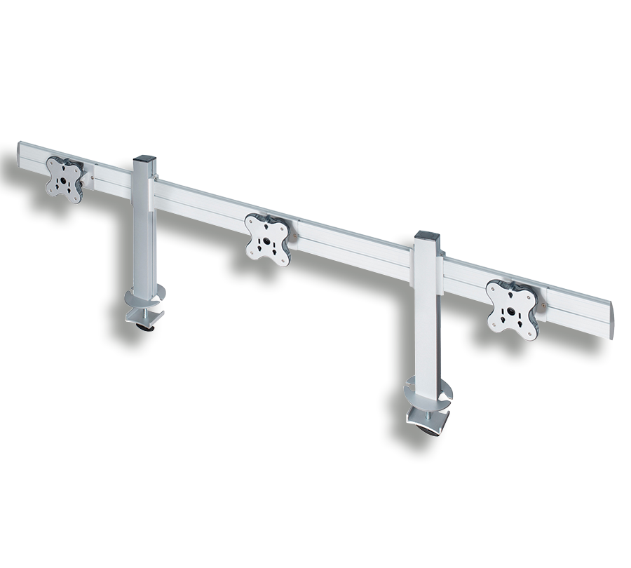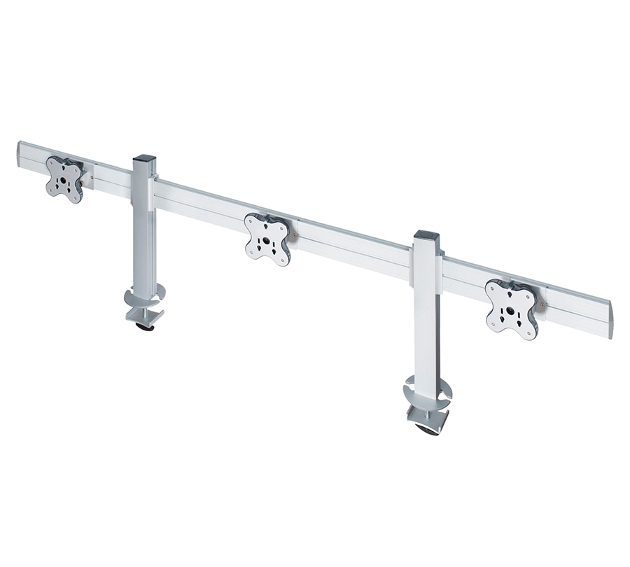 TBSS-300G tabletop mount can hold 3 monitors with a weight of up to 12 kg and a diagonal of up to 24'' on an ergonomic toolbar. It allows to create a compact video wall right on your workdesk. You can adjust the position of each monitor and hide wires in built-in cable channel.