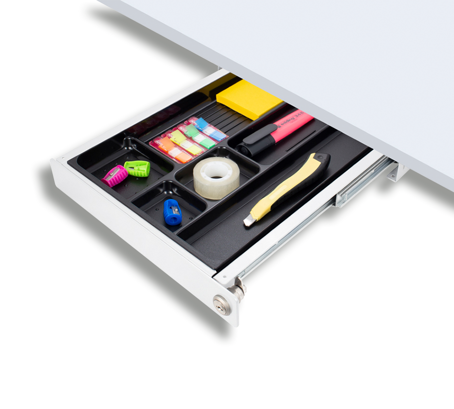 This practical storage drawer allows to free your workspace by moving office accessories under the desktop. Ergonomic design makes it almost unnoticeable.