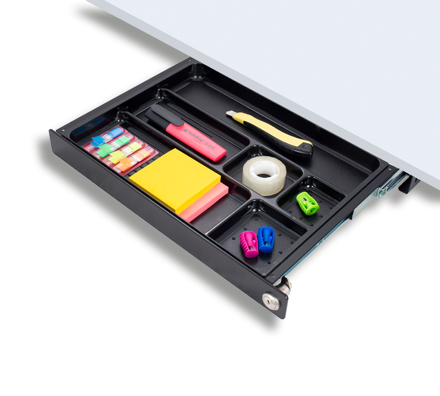 This practical storage drawer allows to free your workspace by moving office accessories under the desktop. Ergonomic design makes it almost unnoticeable.
