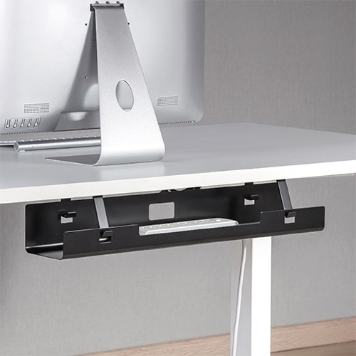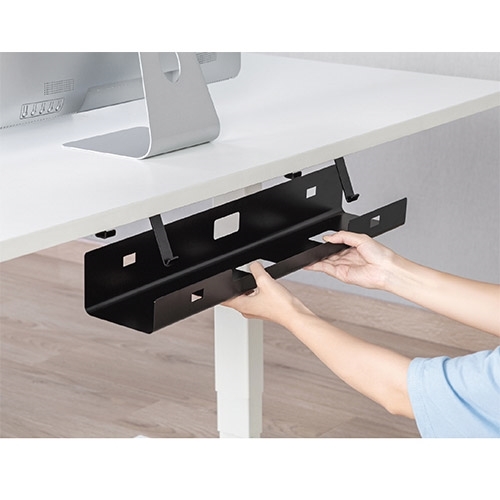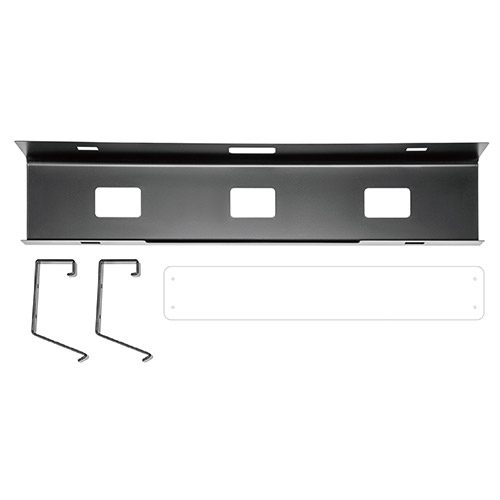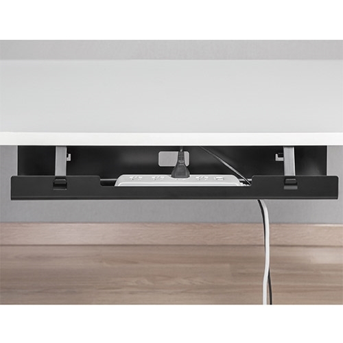 CS-60/1B – horizontal tray for placing cables and a power station at the workplace. Mounts on the underside of the tabletop, with holes for ventilation and cables. Length: 600 mm. Width: 135 mm. Material: steel. Black.