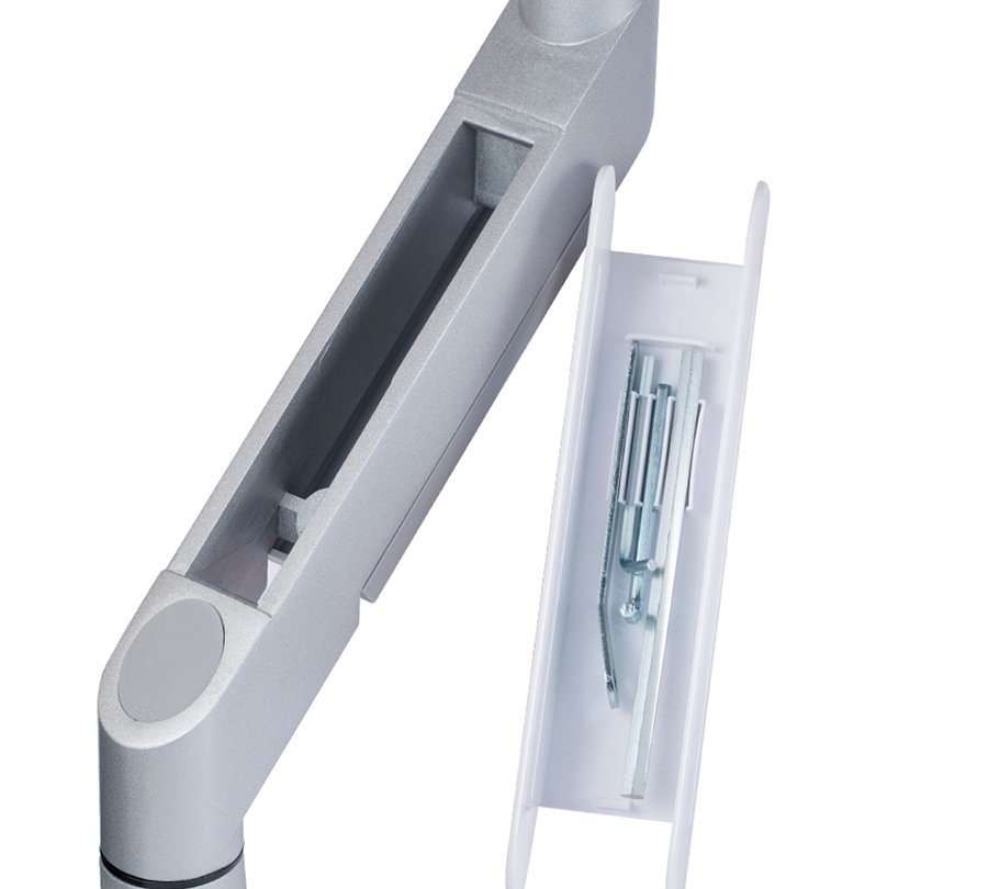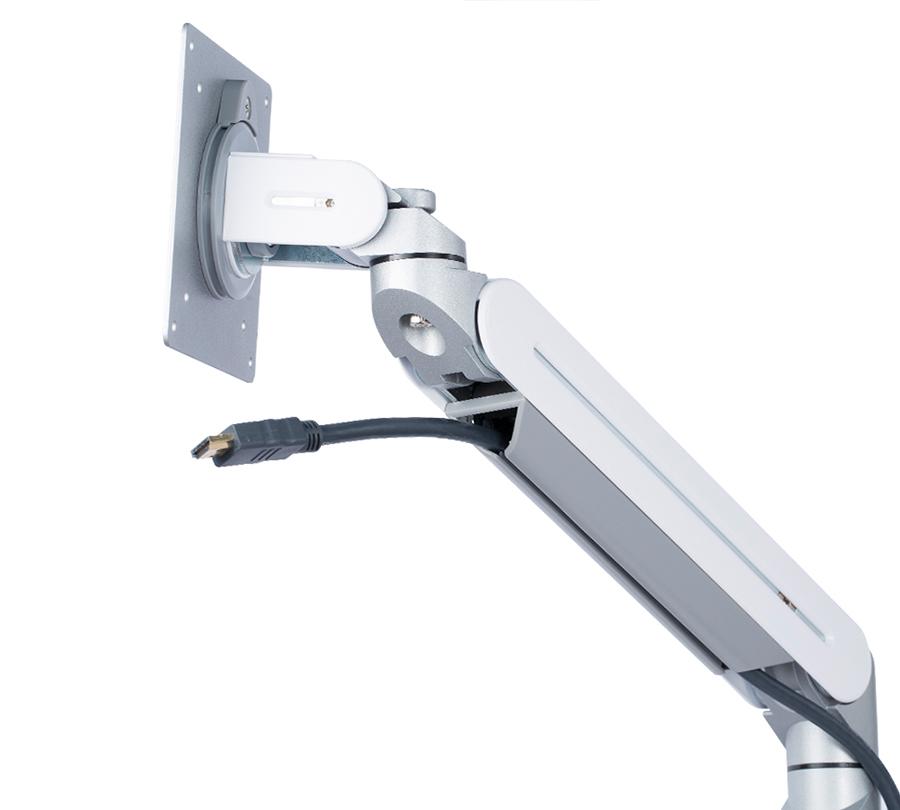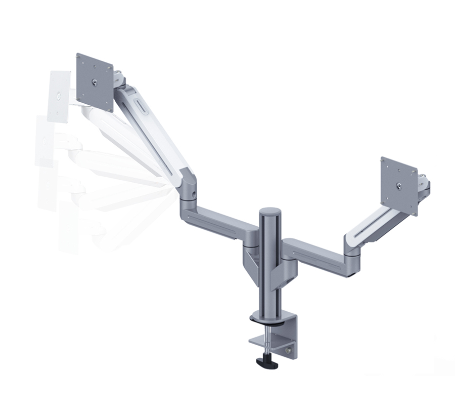 Uchwyt DFS-202DC utrzyma 2 monitory o wadze do 8,5 kg i przekątnej do 24'' każdy. Elastyczne mechanizmy pozwalają idealnie ustawić pozycję monitora, a kanały na kable chowają przewody.