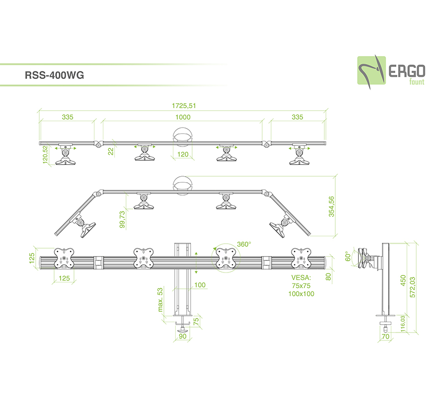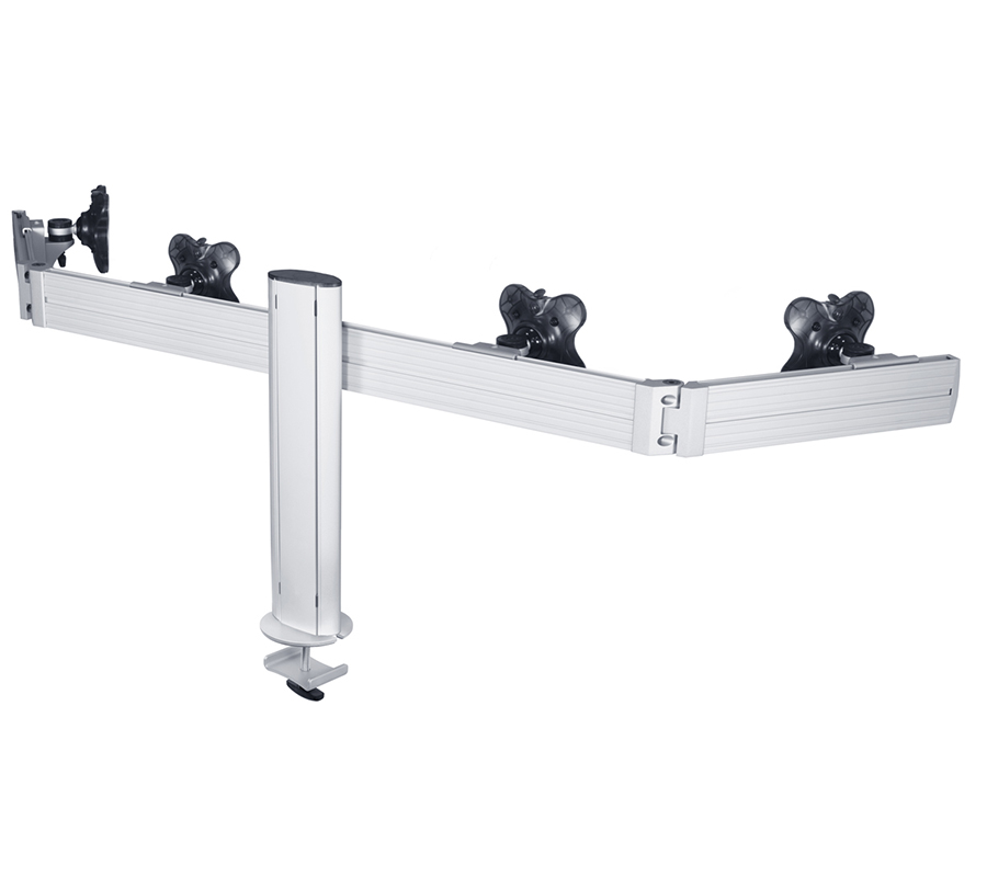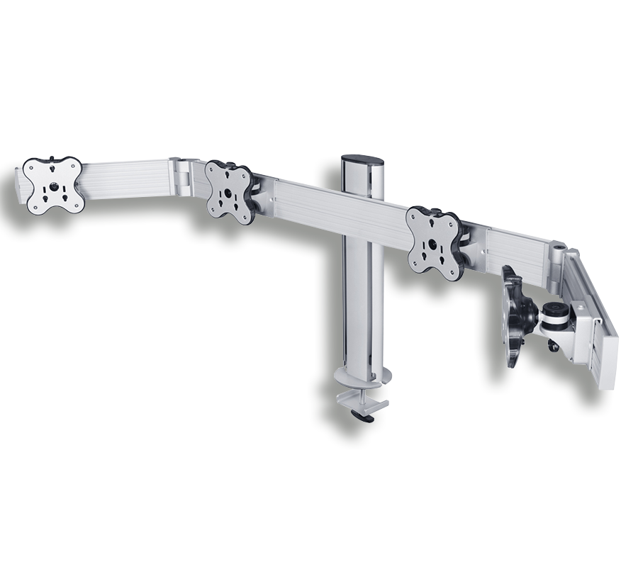 Uchwyt biurkowy RSS-400WG utrzyma na tym samym poziome 4 monitory o wadze do 12 kg i przekątnej do 24''. Możesz indywidualnie dopasować każdy boczny panel uchwytu, tworząc doskonały widok na kilka monitorów.