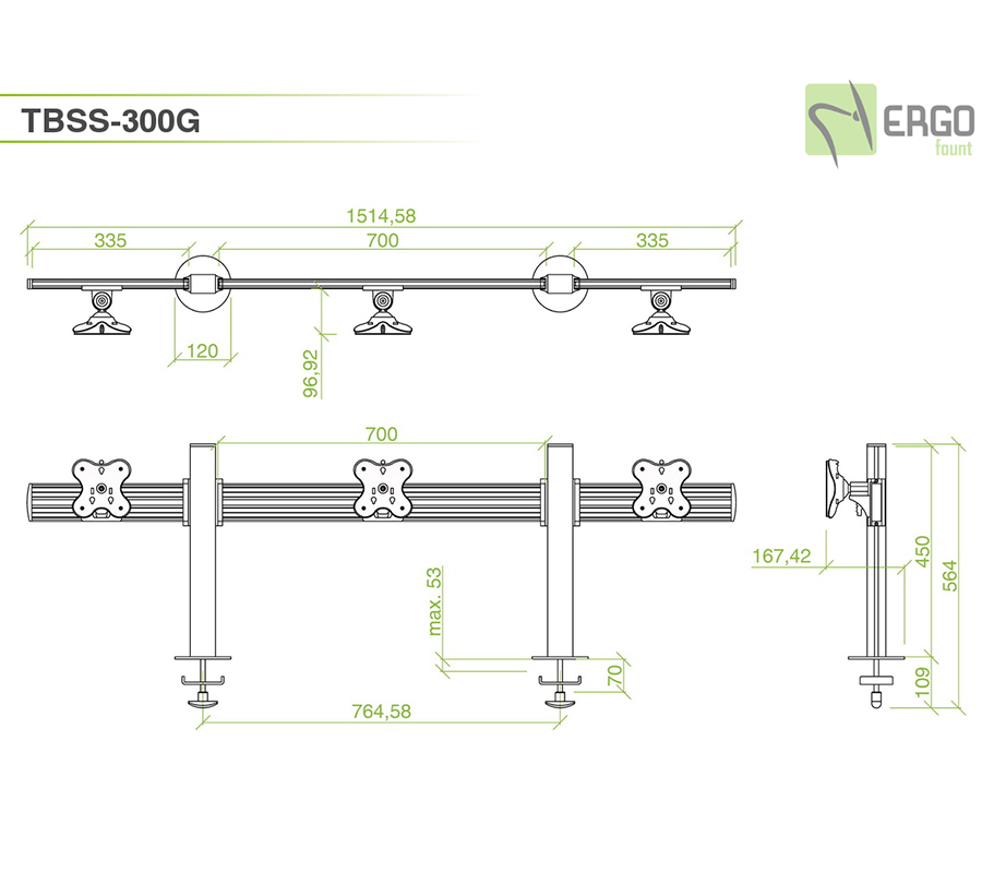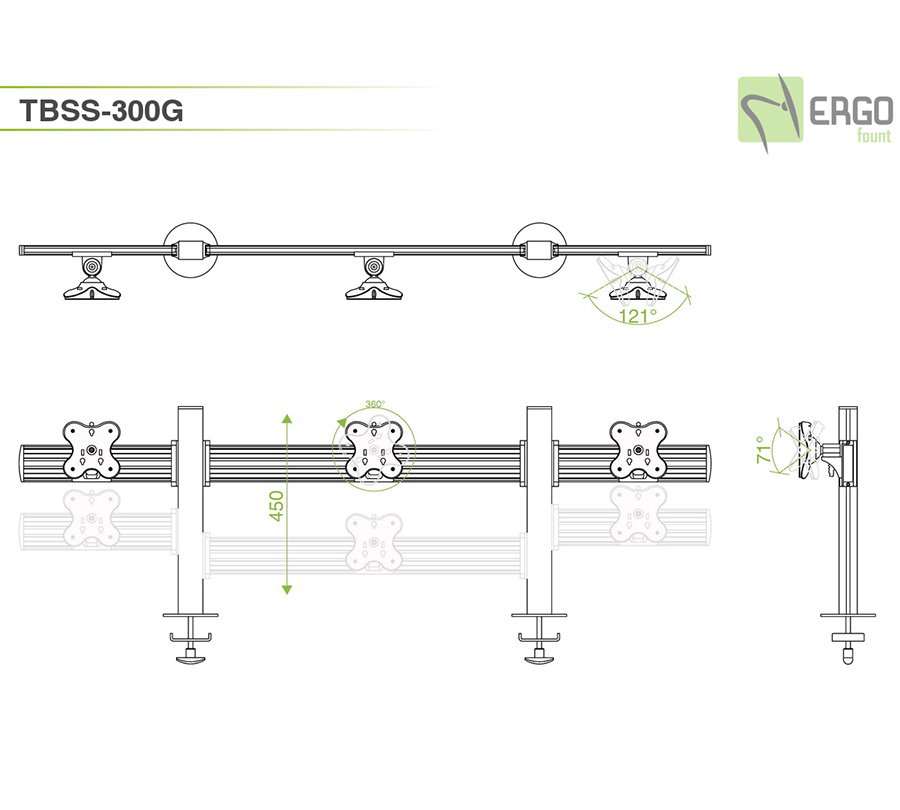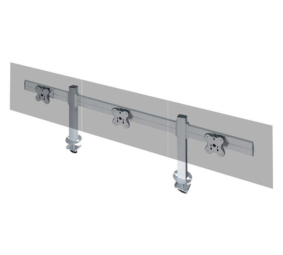 Uchwyt biurkowy TBSS-300G utrzyma na ergonomicznej listwie aż 3 monitory o wadze do 12 kg i przekątnej do 24''. Pozwala na stworzenie kompaktowej ściany wideo bezpośrednio na biurku. Możesz dostosować położenie każdego monitora i schować przewody we wbudowanym kanale kablowym.