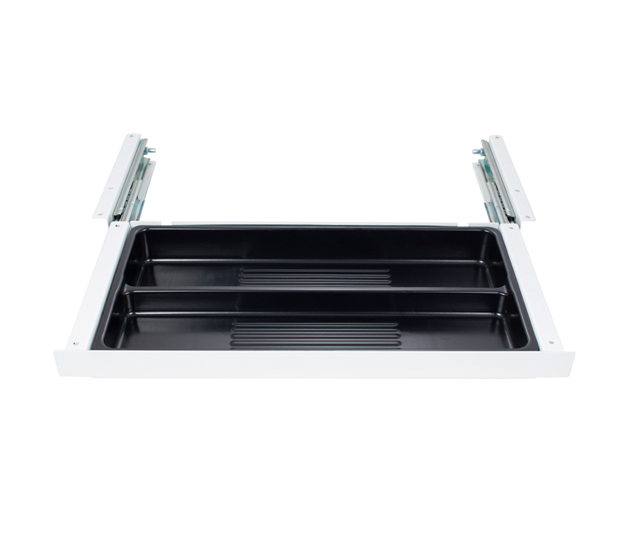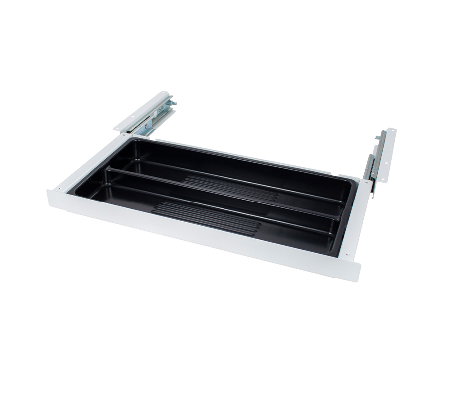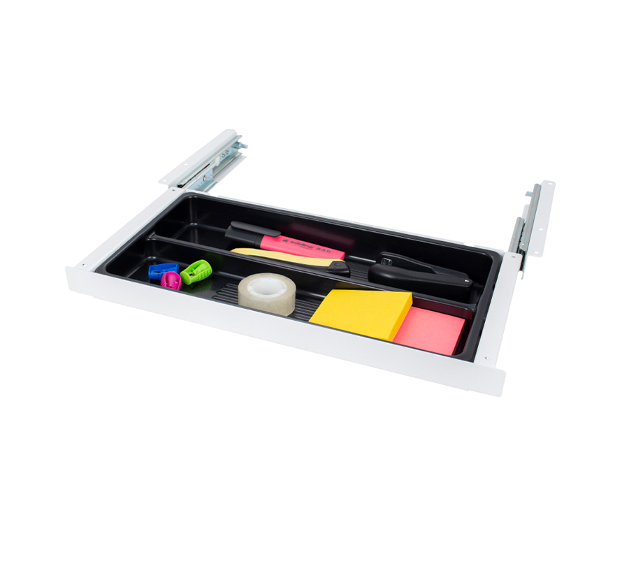 Ta praktyczna szuflada do przechowywania pozwala zwolnić miejsce do pracy, przenosząc akcesoria biurowe pod blat. Ergonomiczny design czyni ją praktycznie niezauważalną.