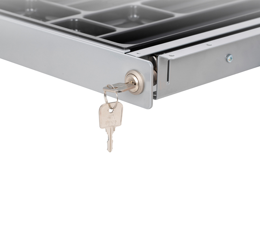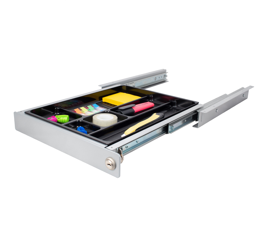 Ta praktyczna szuflada do przechowywania pozwala zwolnić miejsce do pracy, przenosząc akcesoria biurowe pod blat. Ergonomiczny design czyni ją praktycznie niezauważalną.