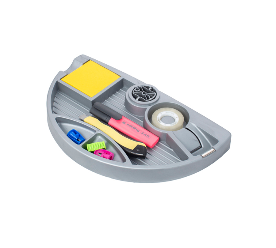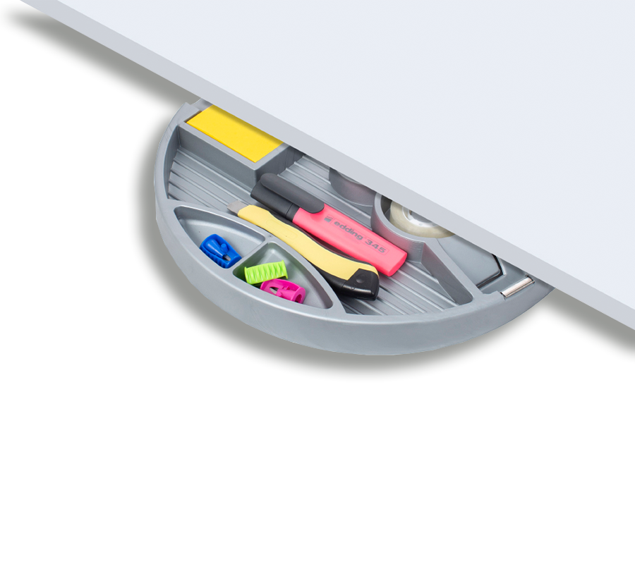 Ta praktyczna szuflada do przechowywania pozwala zwolnić miejsce do pracy, przenosząc akcesoria biurowe pod blat. Ergonomiczny design czyni ją praktycznie niezauważalną.