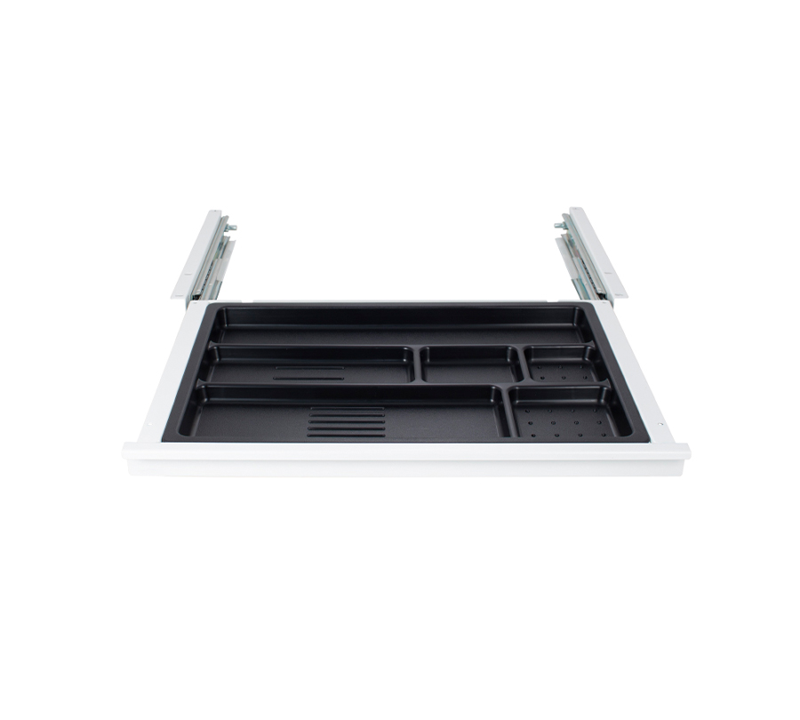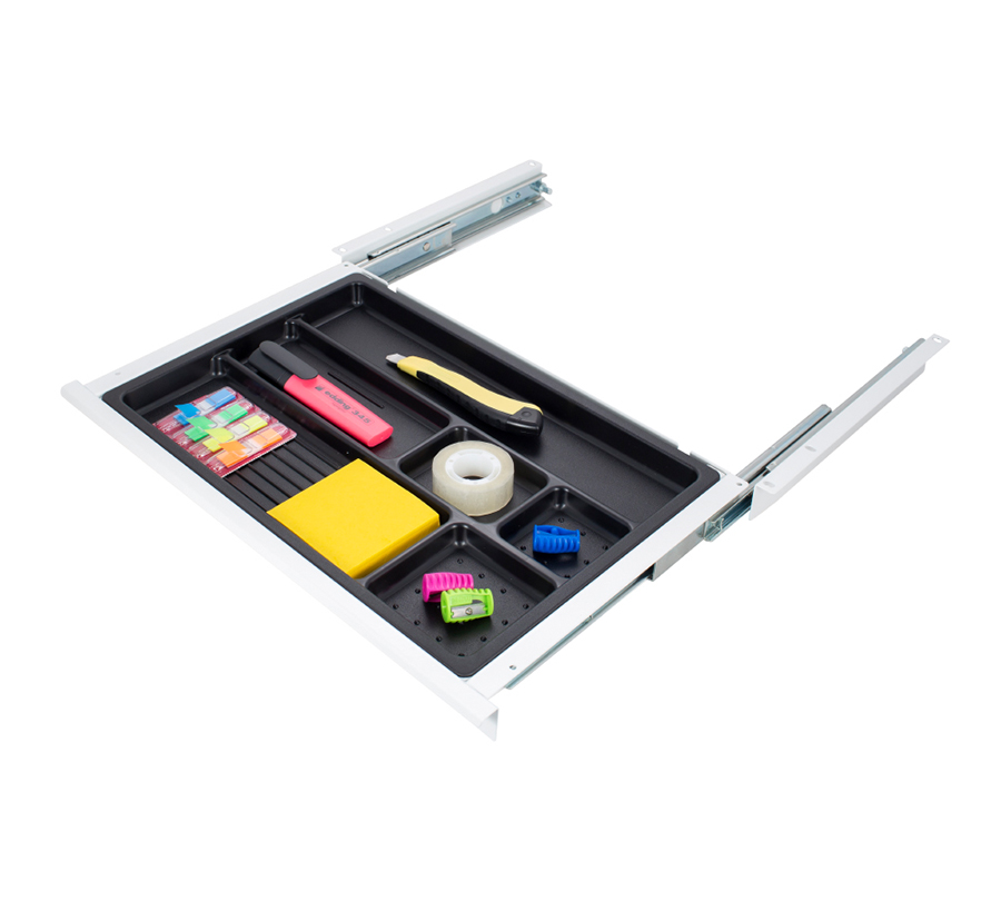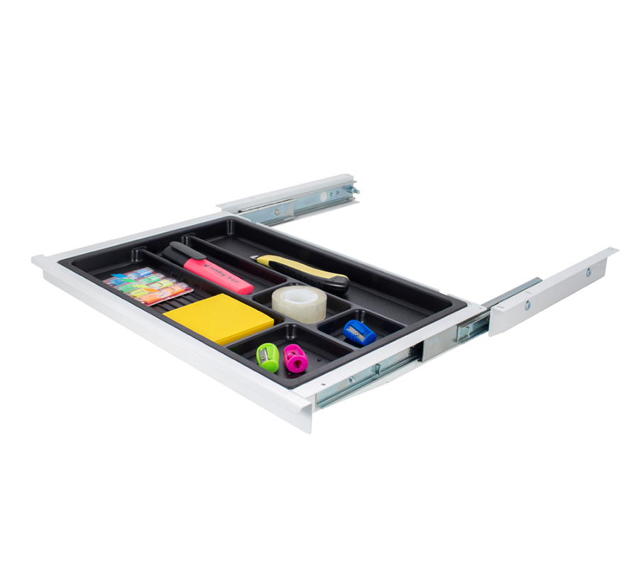 Ta praktyczna szuflada do przechowywania pozwala zwolnić miejsce do pracy, przenosząc akcesoria biurowe pod blat. Ergonomiczny design czyni ją praktycznie niezauważalną.
