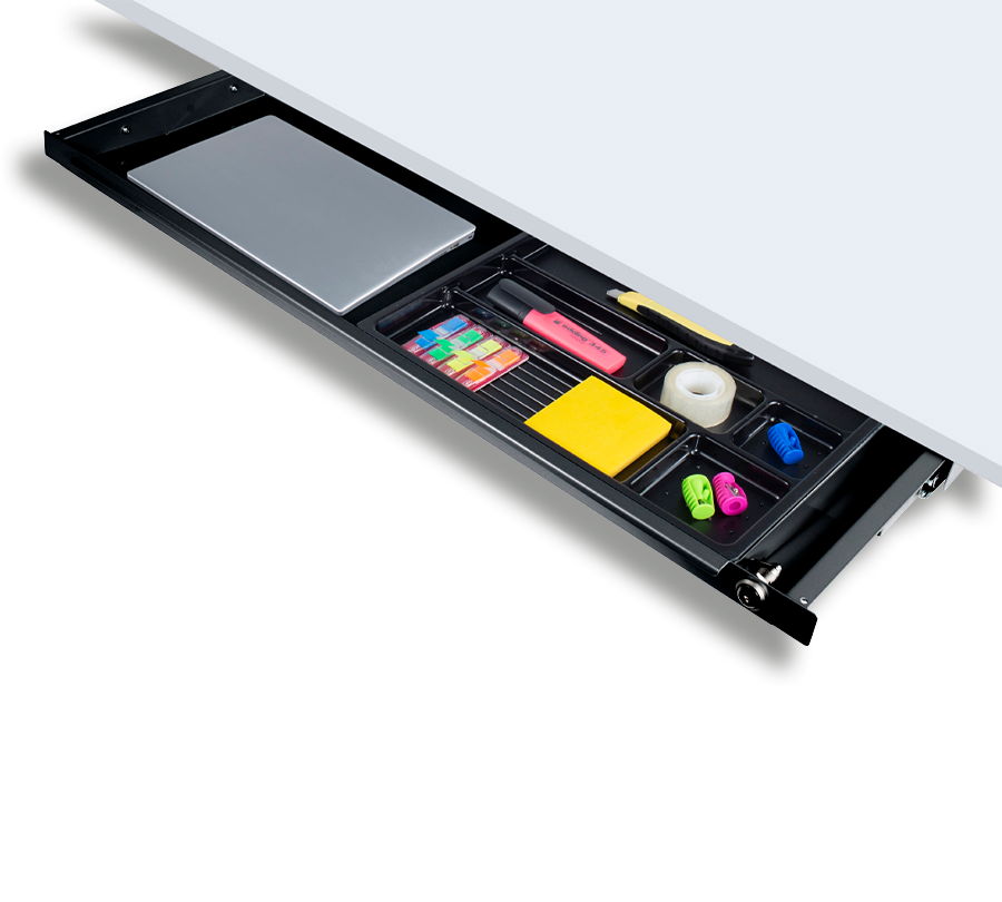 Ta praktyczna szuflada do przechowywania pozwala zwolnić miejsce do pracy, przenosząc akcesoria biurowe pod blat. Szeroka podkładka pozwala na przechowywanie laptopów i dokumentów w formacie A4.