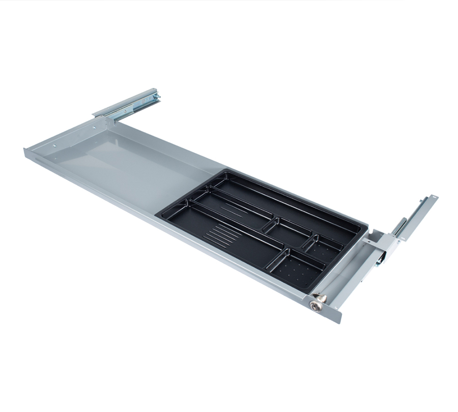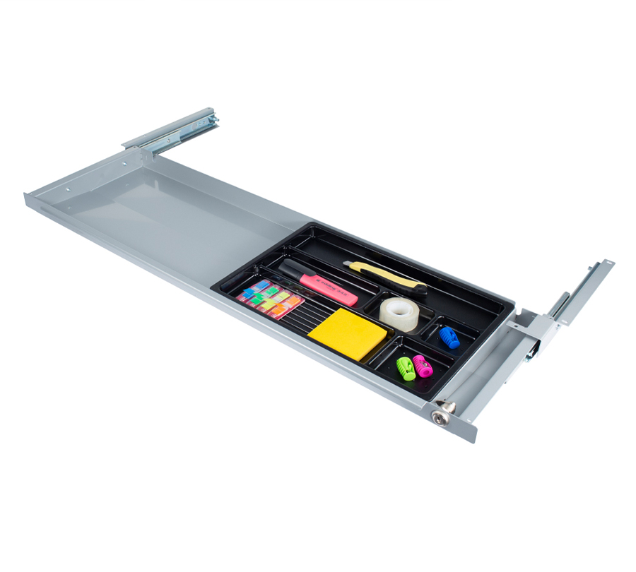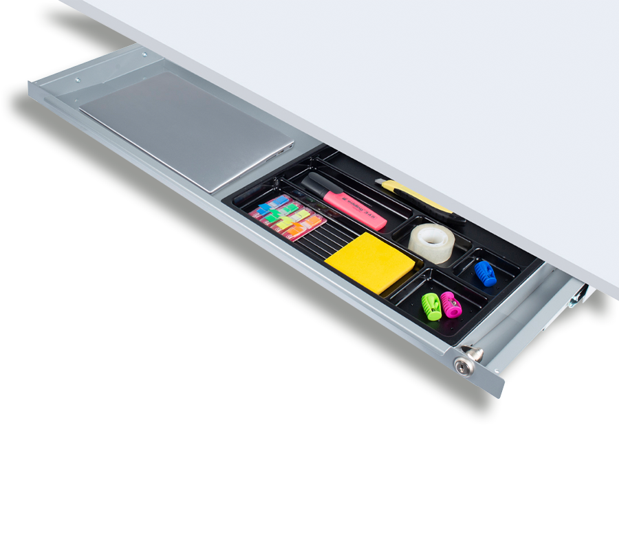Ta praktyczna szuflada do przechowywania pozwala zwolnić miejsce do pracy, przenosząc akcesoria biurowe pod blat. Szeroka podkładka pozwala na przechowywanie laptopów i dokumentów w formacie A4.