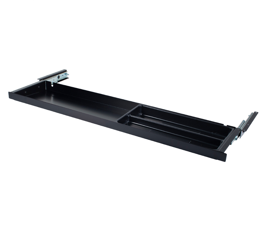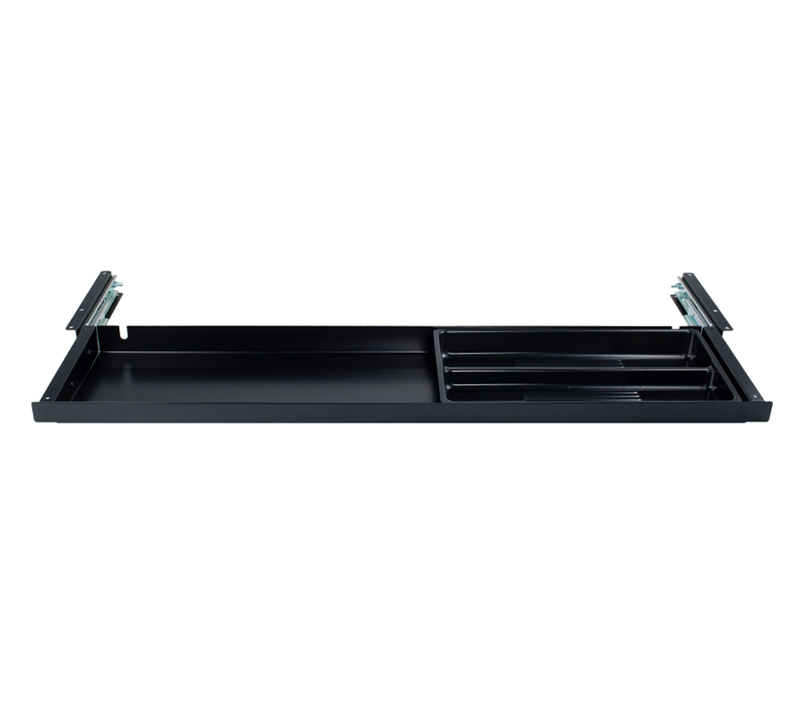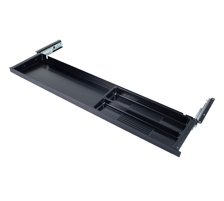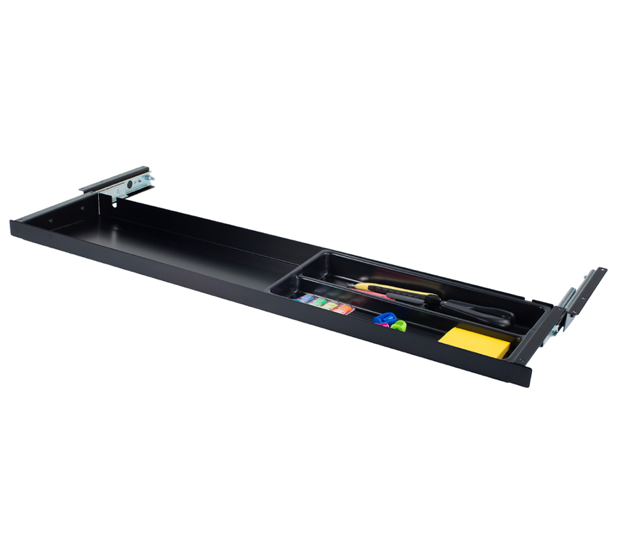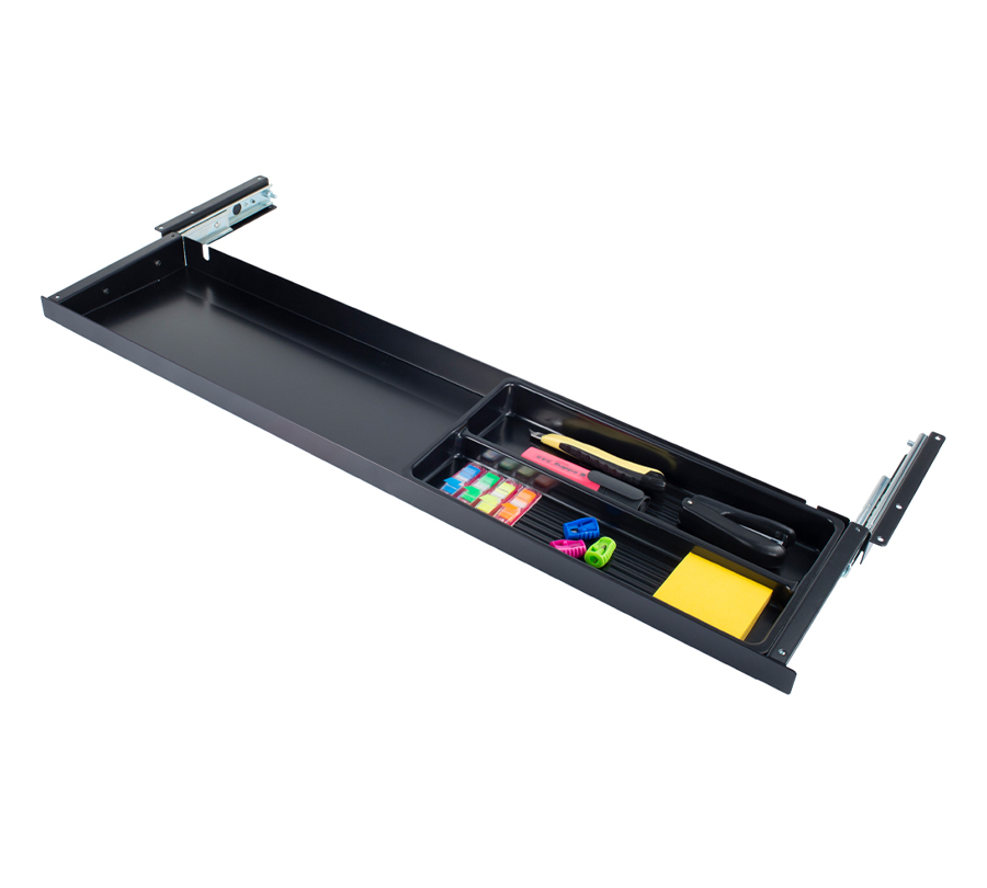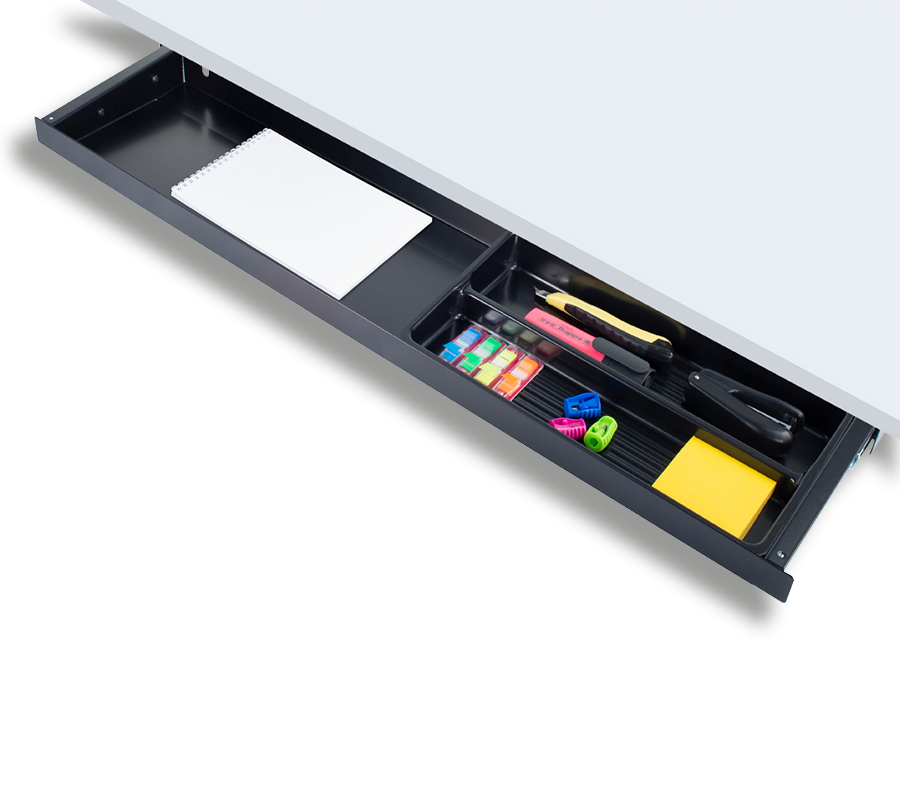 Ta praktyczna szuflada do przechowywania pozwala zwolnić miejsce do pracy, przenosząc akcesoria biurowe pod blat. Ergonomiczny design czyni ją praktycznie niezauważalną.