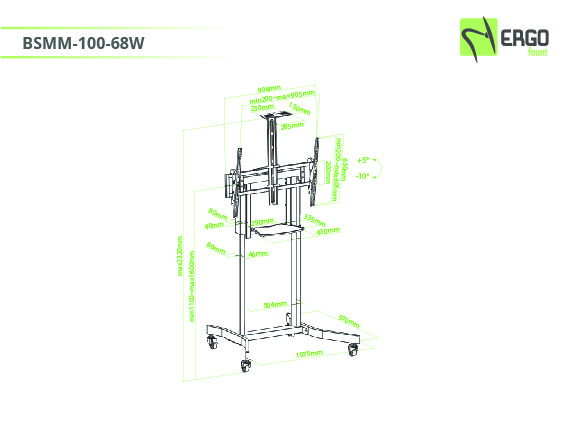 BSMM-100-68W to zmotoryzowany mobilny stojak na ekrany do wyświetlaczy 55-100''. VESA 200x200...800x600. Stojak wyposażony jest w uchwyt do kamery wideokonferencyjnej oraz półkę na AV sprzęt,każdy o maksymalnym obciążeniu 5 kg. Odległość od podłogi do środka wyświetlacza: 1100 – 1600 mm. Pochylenie: –10...+5°. Maksymalne obciążenie: 120 kg.
